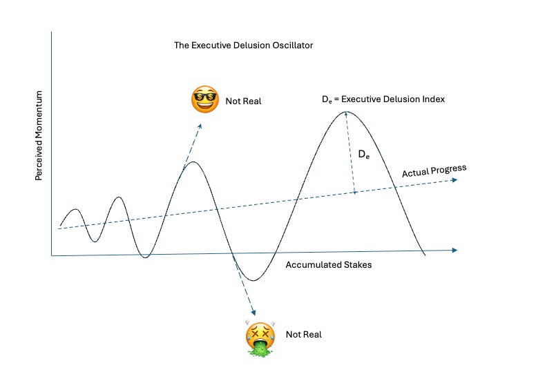 Anyone who has spent time building a company eventually encounters a curious phenomenon that does not appear in most business textbooks. It is not a financial metric or an operational KPI. It is better understood as an empirically characterized psychological instrument. I call this phenomenon the Executive Delusion Oscillator. Despite its widespread observability and measurable consequences, it remains absent from most business school curricula.
